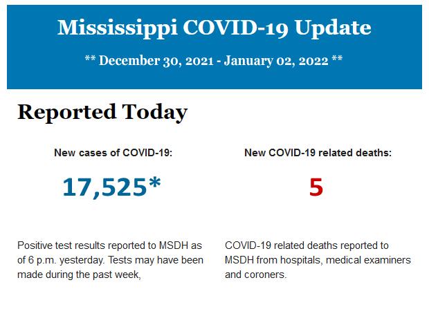 **New COVID-19 positive test results reported to MSDH for the four-day period (December 30 through January 02) as of 3 p.m. yesterday.