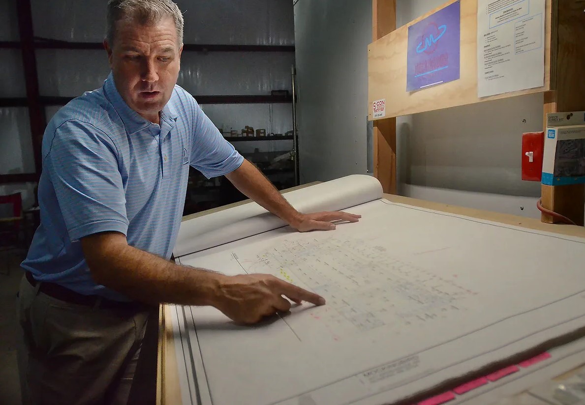 A plumber works on the watering system in a growing room at the Mockingbird Cannabis facility, currently under construction in Raymond, Tuesday, May 10, 2022. Credit: Vickie D. King/Mississippi Today