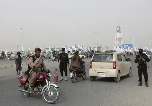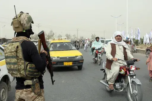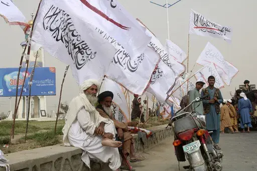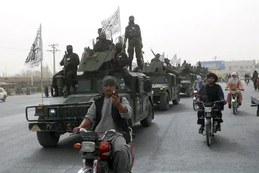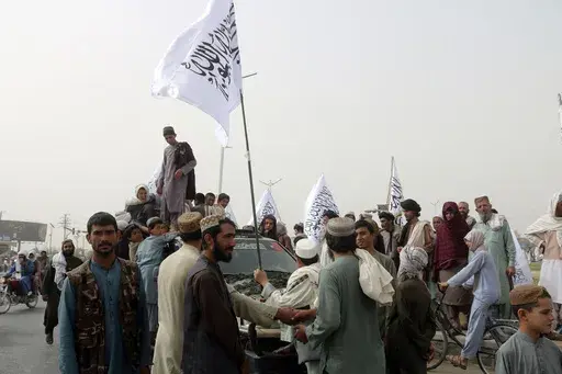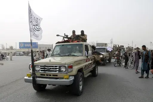 In the southern city of Kandahar, the spiritual birthplace of the Taliban, military personnel posed with armored vehicles. Young men rode through the city on bicycles, motorcycles and cars, waving flags and brandishing weapons. Toddlers clutched small white Taliban flags bearing a photo of Defense Minister Maulvi Mohammad Yaqoob on the bottom right corner.