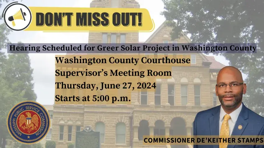 Central District Mississippi Public Service Commissioner De’Keither Stamps will hold a hearing on Thursday, June 27 to consider the petition of Greer Solar, LLC, to construct, own, and operate a solar electric generating and storage facility in Washington County.