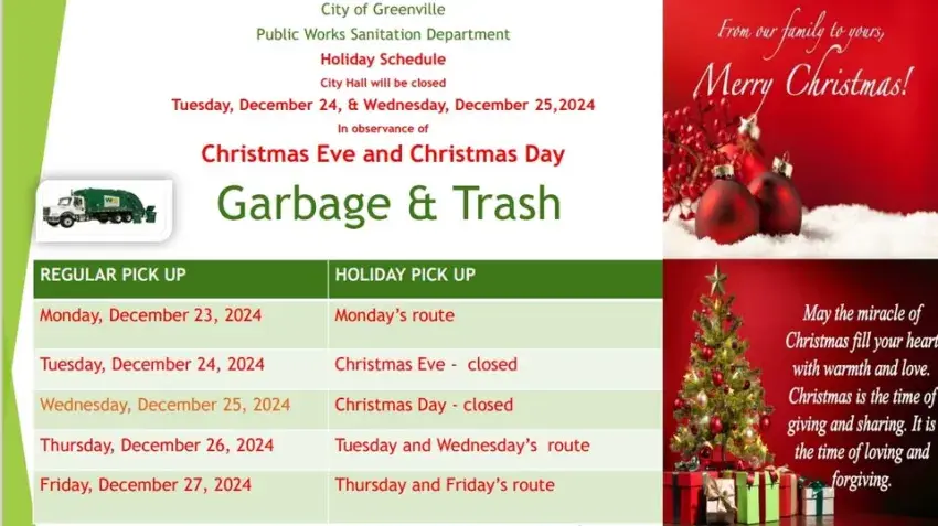 Mayor Simmons announces the garbage and trash pick-up schedule for the Christmas Holiday. The City of Greenville will be closed on Tuesday, December 24, & Wednesday, December 25, 2024, in observance of Christmas Eve and Christmas Day. The garbage and trash pick-up schedule for the week of Christmas will go as follows: