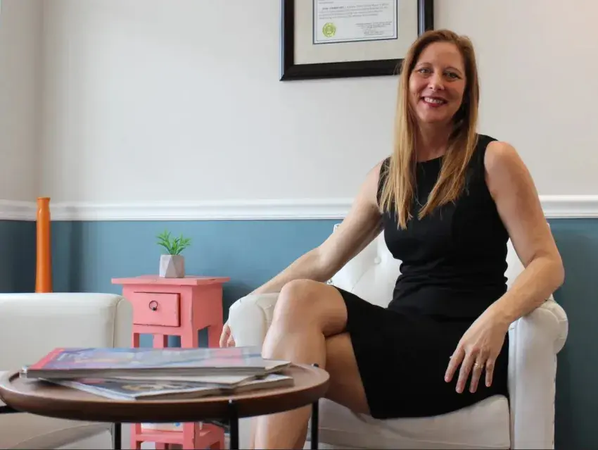 Geneva Dummer, the owner of The Meeting Place, sits in the lobby of her co-working space on Water Street in Biloxi. The Gulf Coast entrepreneur has been steadily growing the business and will soon open a third location in Gulfport. Credit: Sara DiNatale / Mississippi Today
