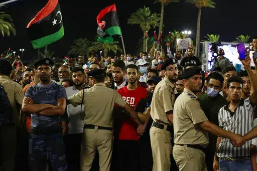 People chant slogans during a protest to denounce the October military coup, in Khartoum, Sudan, Saturday, Dec. 25, 2021. Sudanese security forces fired tear gas to disperse protesters as thousands rallied since earlier in the day, even as authorities tightened security across Khartoum, deploying troops and closing all bridges over the Nile River linking the capital with its twin city of Omdurman and the district of Bahri, the state-run SUNA news agency reported.(AP Photo/Marwan Ali)