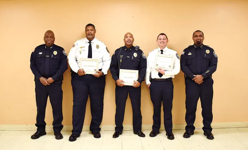 Officers of the Greenville Police Department along with family, friends and colleagues gathered Thursday to witness the promotions of officers Timothy Elzy and Nakia Hunt to captain and Michael Muirhead to lieutenant.