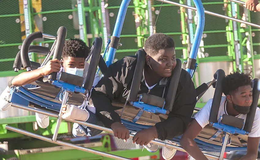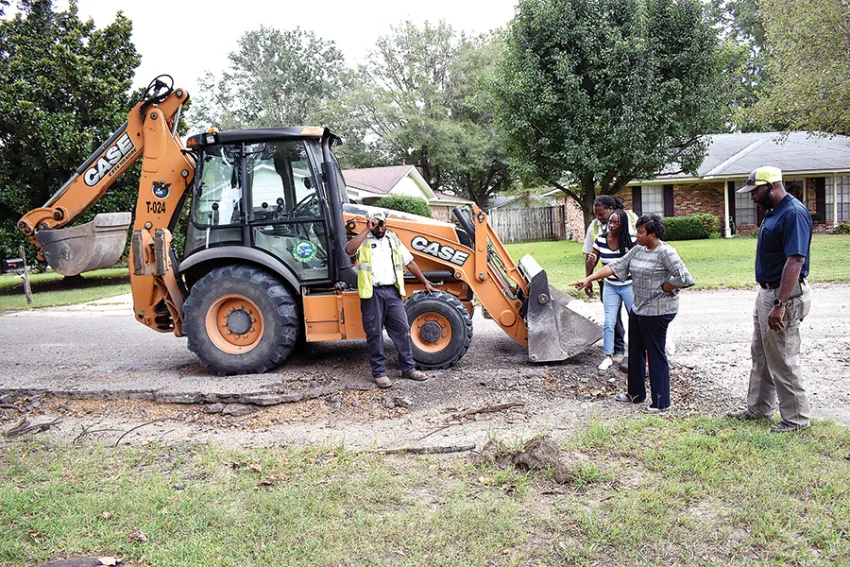 Councilwoman Tasha Banks, second from right, and Street/Utility Director Ronnie Washington, far right, examine a portion of curb on Pear Lane that had turned almost completely over along with Ward 5 resident Tasha Hudson, center, and operators Steven Gross and Lamont Brown. The curb has since been repaired and Pear Lane is now awaiting an overlay by the Washington County Road Department.