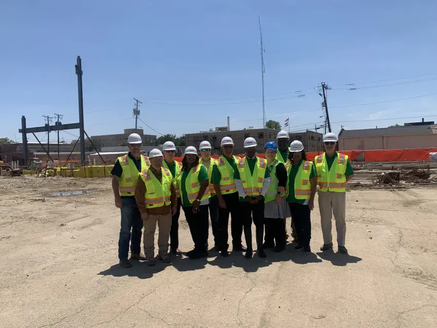 City officials took a tour of the Federal Building construction site with government and contacting officials on Tuesday May 2. From left to right are: Tommy Boykins with Duval Decker Architects; project manager Ken Thomas, Councilman Vernon Greenlee, Councilwoman Lurran Thomas Kingdom, GSA project manager Stephen Cox, Mayor Errick Simmons, Pamela Patrick architect with US Courts, Councilman James Wilson, Councilwoman Lois Hawkins and Councilman Al Brock