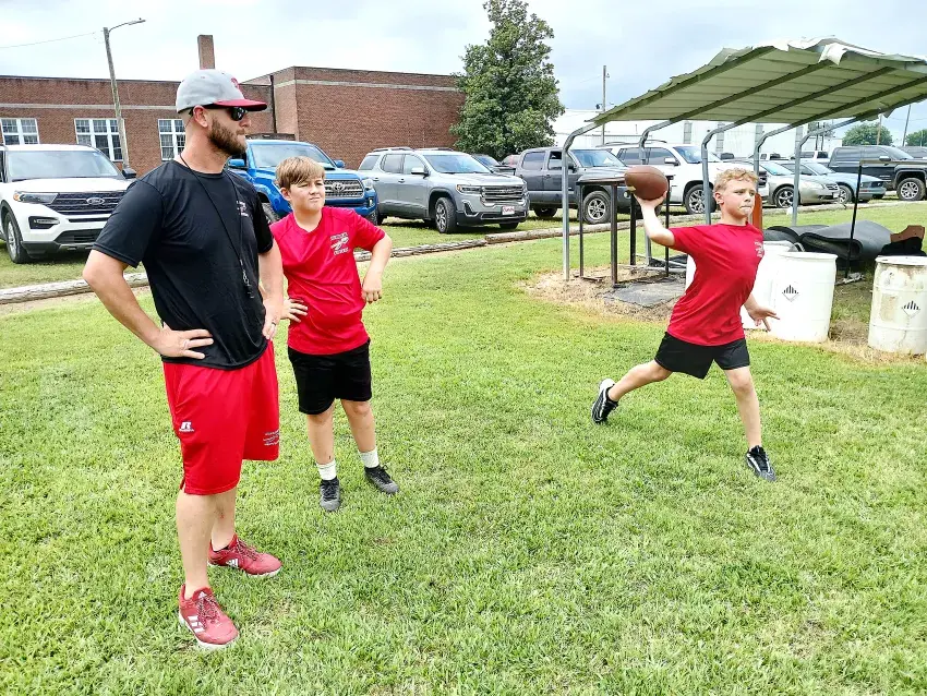 Will Rodgers is the new head varsity football coach at Deer Creek School. At Deer Creek, Coach Rodgers preaches competition at every level, including in junior high. He is pictured here watching his young son, Liam, throw the ball during drills last week. His stepson, Aiden, is standing behind Liam.