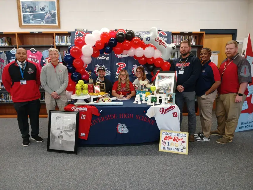 Riverside High School's Allie Reed (center) signed a softball scholarship to attend Arkansas State University Mid-South. Allie was joined in the ceremony by her parents seated next to her, Paul and Chasity Cordell. She was also joined by (from left) Assistant Principal John Henderson, pitching coach Dermur L Johnson, Riverside High School Softball Coach Brad Andrews, Principal Shawneequa Beal, and Assistant Coach Ryan Chunn.