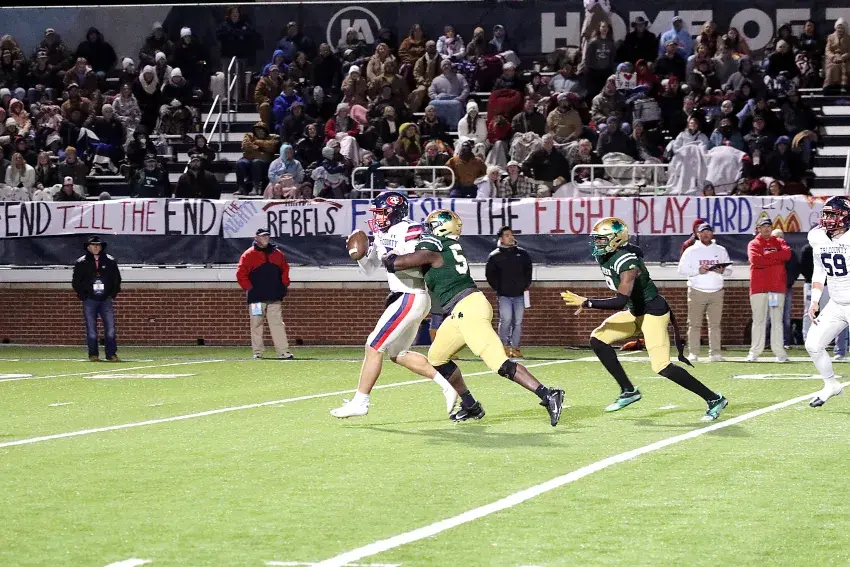 St. Joseph defender Alex Foster (seen here sacking Tri-County QB Bryce Warriner in last year’s MAIS Class 4A State Championship) will anchor a talented Irish defensive line this upcoming fall. At 6-foot-4 and 283 pounds, Foster has scholarship offers from by a number of FBS programs, including Mississippi State, Arkansas, Baylor, Georgia Tech and Kentucky.