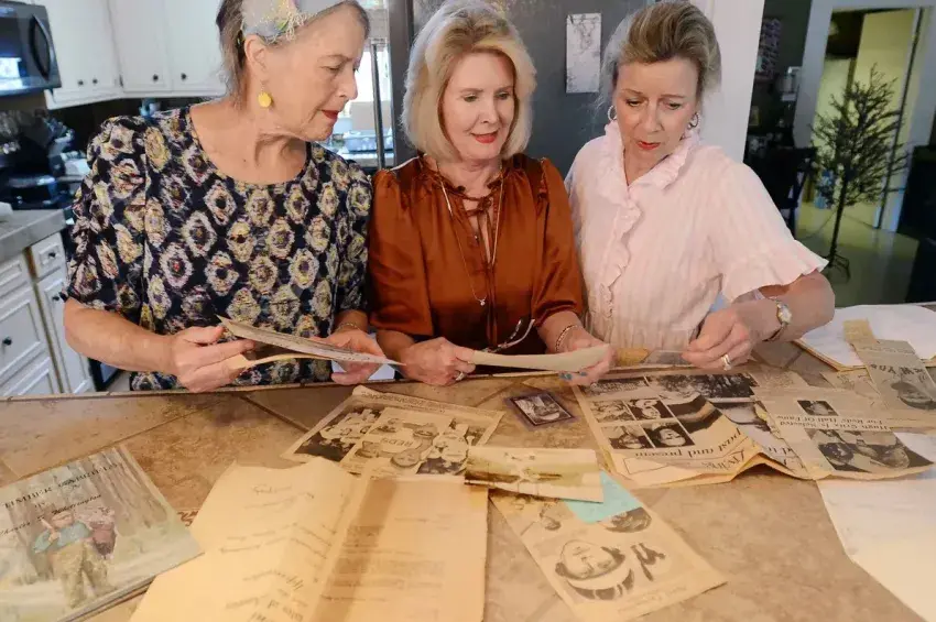 Durden Pillow Moss (left), her cousin Jenny Payne Gardner (center) and sister Julie Pillow Crosthwaith, reminisce as they look over some of the hundreds of newspaper clippings and other memorabilia depicting their grandfather Hugh "Hughie" Melville Critz at Gardner's Greenwood home, Thursday, Aug. 1, 2024. Critz played Major League baseball for the New York Giants in the 1930s and Cincinnati Reds in the 1920s. Credit: Vickie D. King/Mississippi Today