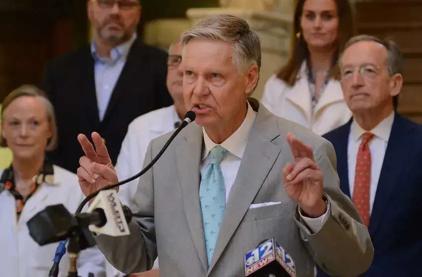 Jack Reed, former Mayor of Tupelo, and other business leaders from across the state, urge the legislature to pass the Medicaid expansion bill, during a press conference at the state Capitol, Tuesday, April 23, 2024 Credit: Vickie D. King/Mississippi Today