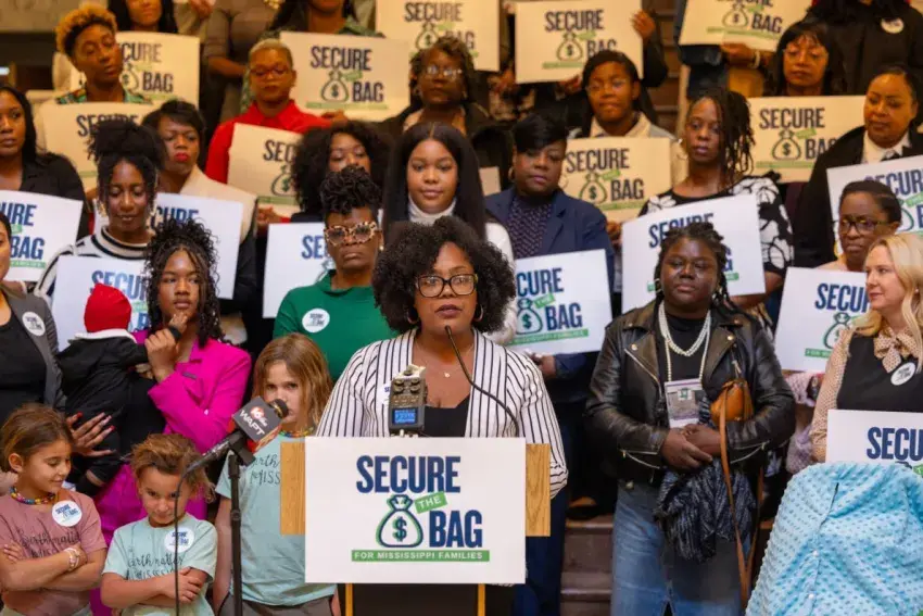 Shequite Wilson Johnson speaks at the Mississippi State Capitol in Jackson, Miss., on Thursday, Feb. 13, 2025. Johnson shared her personal story during the Mississippi Black Women's Roundtable Advocacy Day, highlighting the struggles of working mothers in Mississippi and the need for policy changes to support families. Credit: Eric Shelton/Mississippi Today