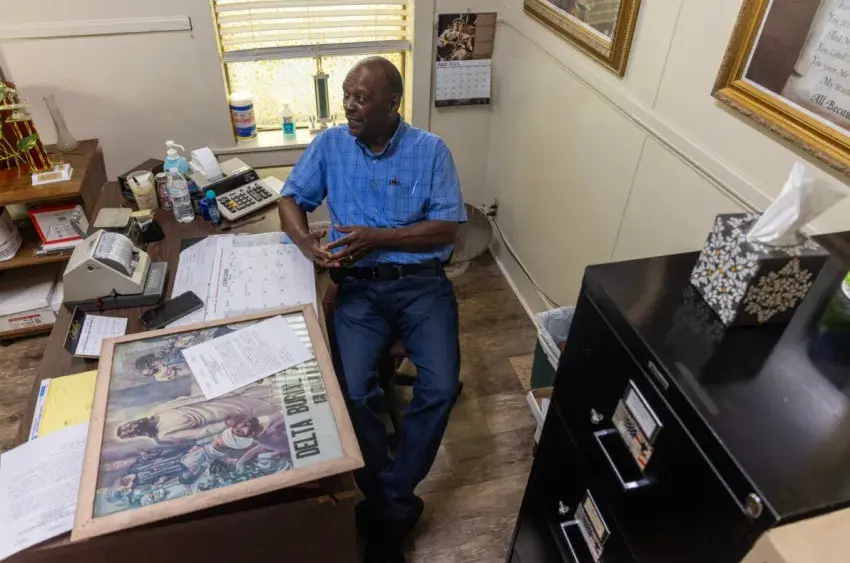 Manuel Killebrew, funeral home director at Delta Burial Corp., discusses the 100-year history of the business in Marks, Miss., on Friday, July 10, 2025. The Black-owned funeral home has served generations of residents in the Mississippi Delta. Credit: Eric Shelton/Mississippi Today