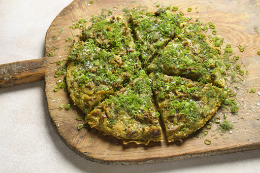 We keep things lighter and more flavorful with Egypt’s spiced frittata-like eggah, which is substantial but balanced, with layer upon layer of flavor thanks to a trio of spices and fresh herbs and scallions.