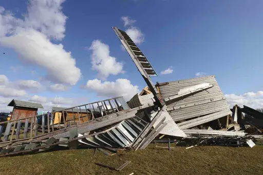 Winds toppled the spire of a church in Wells, southwest England, ripped off parts of the domed roof of London’s O2 Arena and left a trail of felled trees and damaged buildings across several countries.