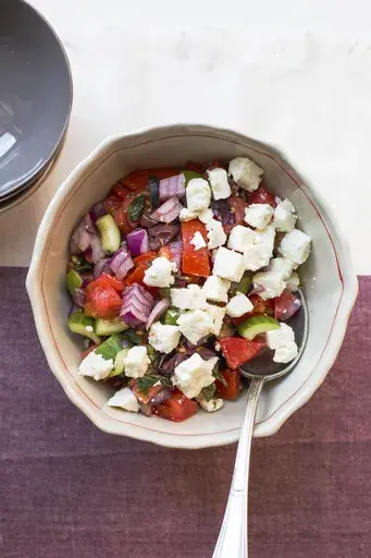 One such cucumber-centric salad is an authentic Greek salad. Greek salad, also known as Horiatiki, usually consists of simple chunks of tomatoes, cucumber, often red onion, olives, and chunks or a slab of feta with an oregano-spiked vinaigrette. Some chefs also add bell pepper.