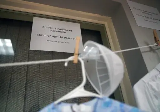 Next to it was a 5-year-old's heavy coat, hat and long, hunter green dress, displayed above sturdy black shoes. “I was never safe and I was a child. He was an adult,” a sign quoted the survivor as saying. “No one helped me when I told them he hurt me.”