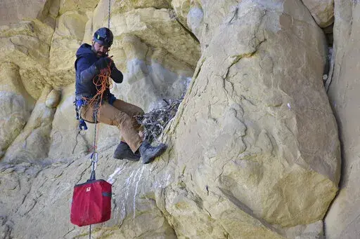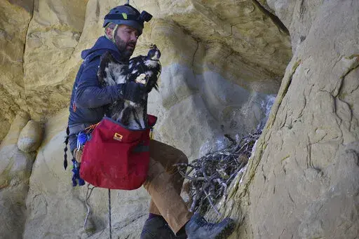 Dangling from a rope 30 feet (9 meters) above the ground with a canvas bag slung around his neck, Bedrosian shouldered his way into a golden eagle nest lodged in a cliff ledge. The scientist made an awkward grab for the young eagle in the nest, slid a leather hood over its head then wrestled it into the bag.