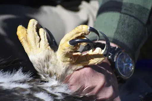 The eaglet went on a scale — about seven pounds (3.2 kilograms). Bedrosian drew some blood from a wing to test for lead exposure, and Preston clamped a metal identification band onto each leg.