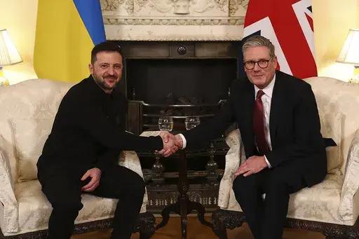 LONDON (AP) — British Prime Minister Keir Starmer embraced Ukrainian President Volodymyr Zelenskyy on Saturday and told him he had the U.K.'s unwavering support, a day after the blowout at the White House with President Donald Trump.